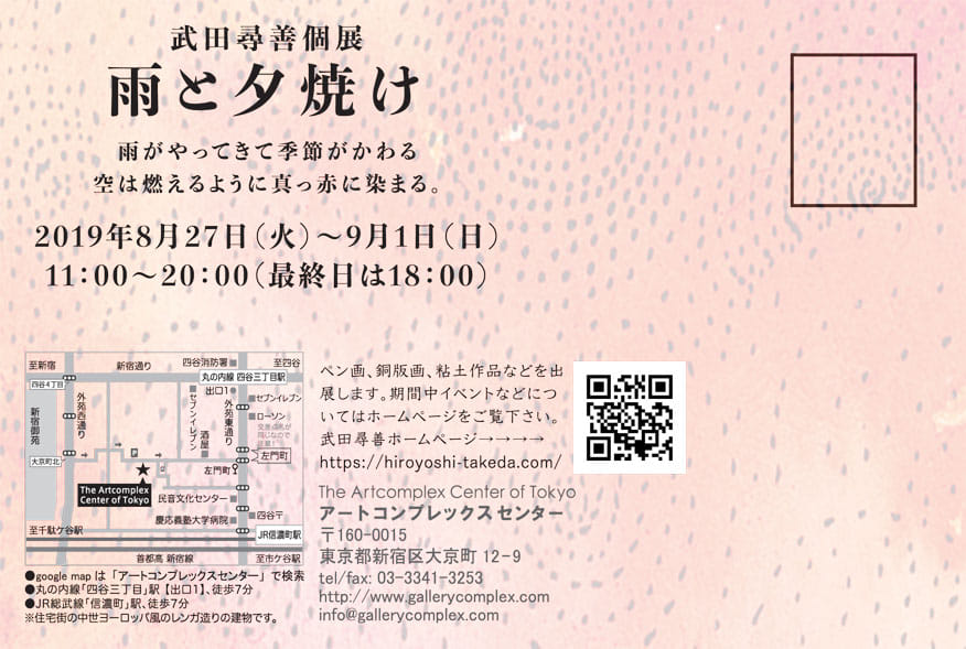 恒例の夏の個展です。雨と夕焼け、水と太陽、大地と宇宙、季節の変わり目と昼夜の変わり目、境界線、生命のはじまりと、おわり。
