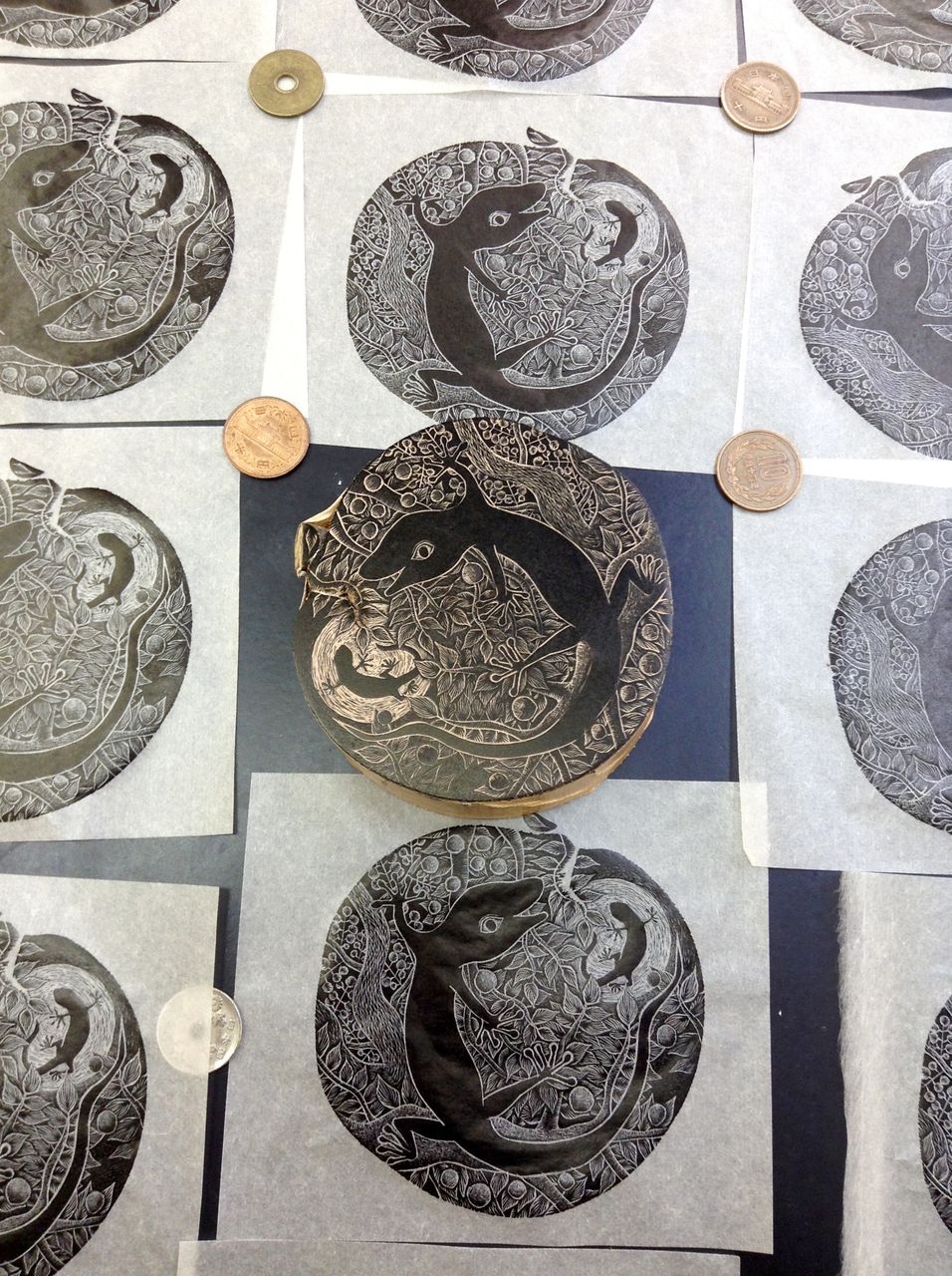2015年06月10日 やもり やもり やもり! やもりは、爬虫類です。やもりは、害虫を食べます。いもりは、両生類なので、似てる名前だけど、全然違う生き物です。 うちの窓には毎日やもりがきます。 たまに、ケンカもしています。でも、やもり、かわいいなあ〜!ということで、版画にしてみました。ヤモリは、英語でゲッコーと言うそうです。 月光ヤモリ
