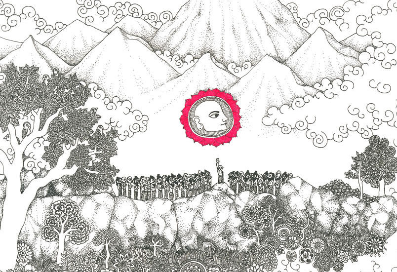 アーユルヴェーダは、インドの「生命の科学」とも呼ばれる学問で、そのアーユルヴェーダの成立神話を絵に描きました。